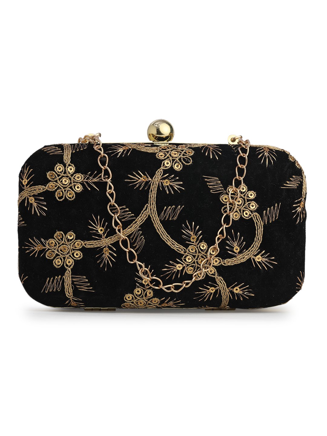 Black & Gold Embroidered Box clutches, Has gold chain shoulder strap, 1 main compartment with twist closure